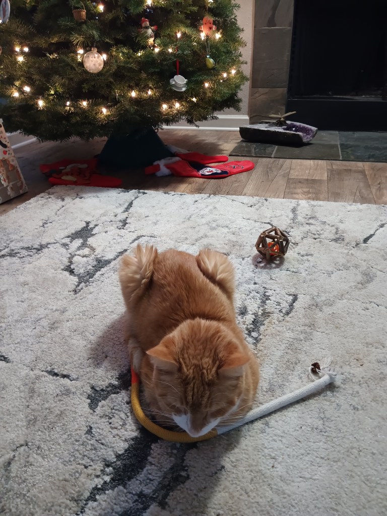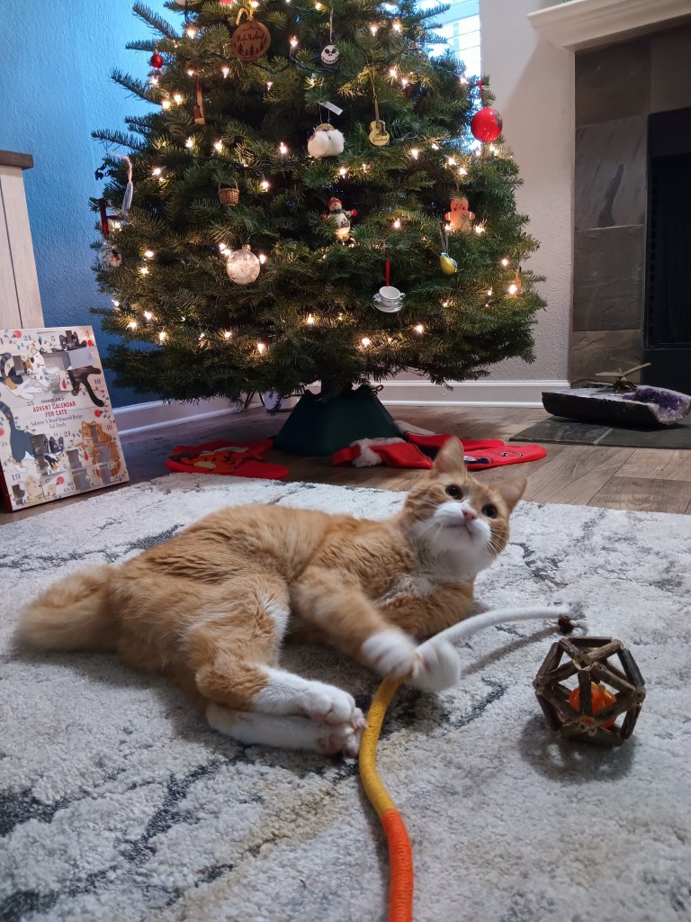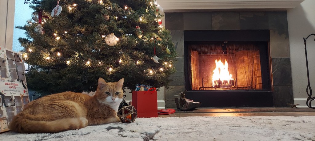 I’m a cat who is very loved and pampered, so almost every time of the year is pretty wonderful, but there is something special about those few weeks when I can sit by the tree, enjoying the lights and scents of the holiday. Peace.