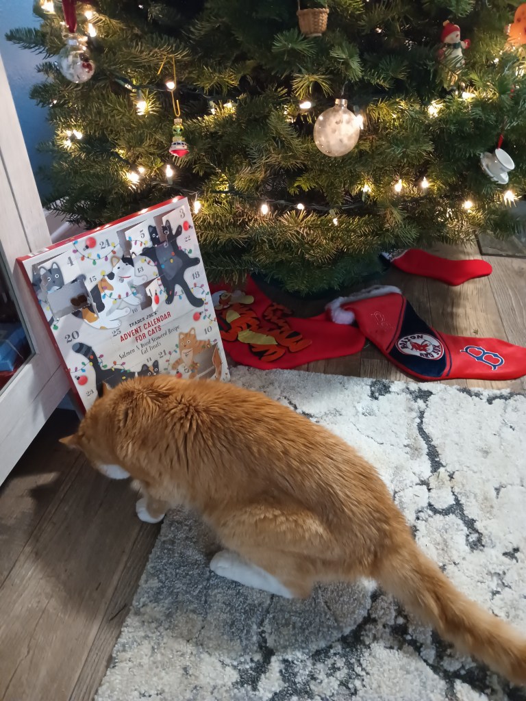 Now I have a place to put my first — and possibly only — Christmas gift. Yes, I was quite surprised and flattered when our cat-loving friend Morgan brought me an Advent calendar. I have no idea exactly what an Advent calendar is, but it has lots of little doors that conceal treats, so I’m all in!