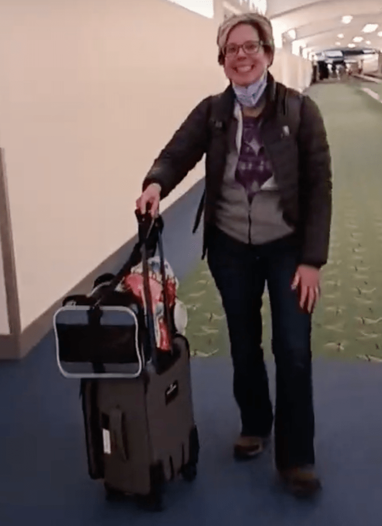 After disembarking the aircraft, Mama C wheeled me down a long hallway full of people and suitcases again. Thankfully, it wasn’t quite as chaotic as that other place. Soon we came to a loud set of mechanical stairs, and down we went. To our surprise, Mama G was waiting at the bottom with a sign with our names on it!
