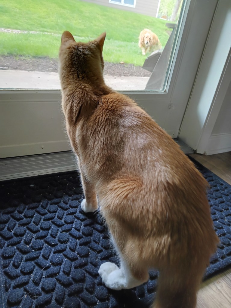 We have a lot more neighbors here, including some four-legged ones! Sometimes they get pretty up close and personal with me, which I enjoy. Dogs are so silly! At least I know how to take care of my own bathroom needs.