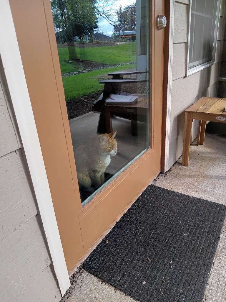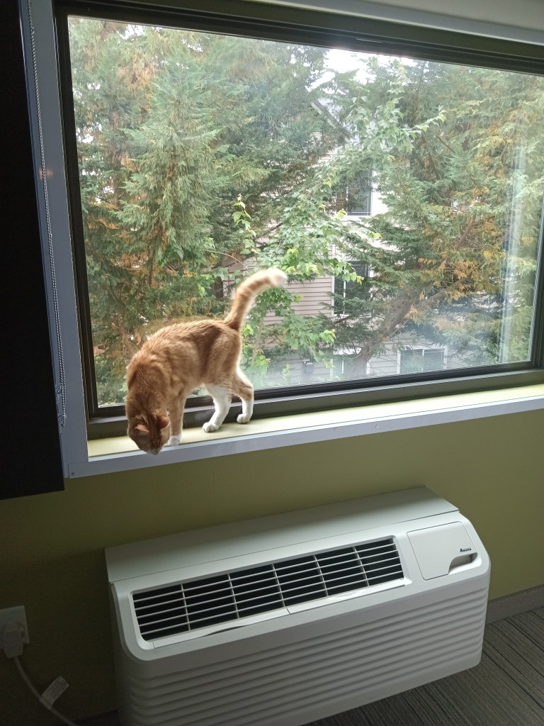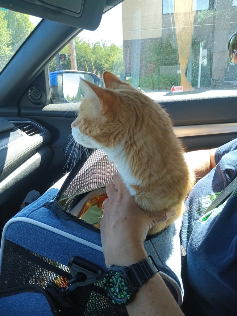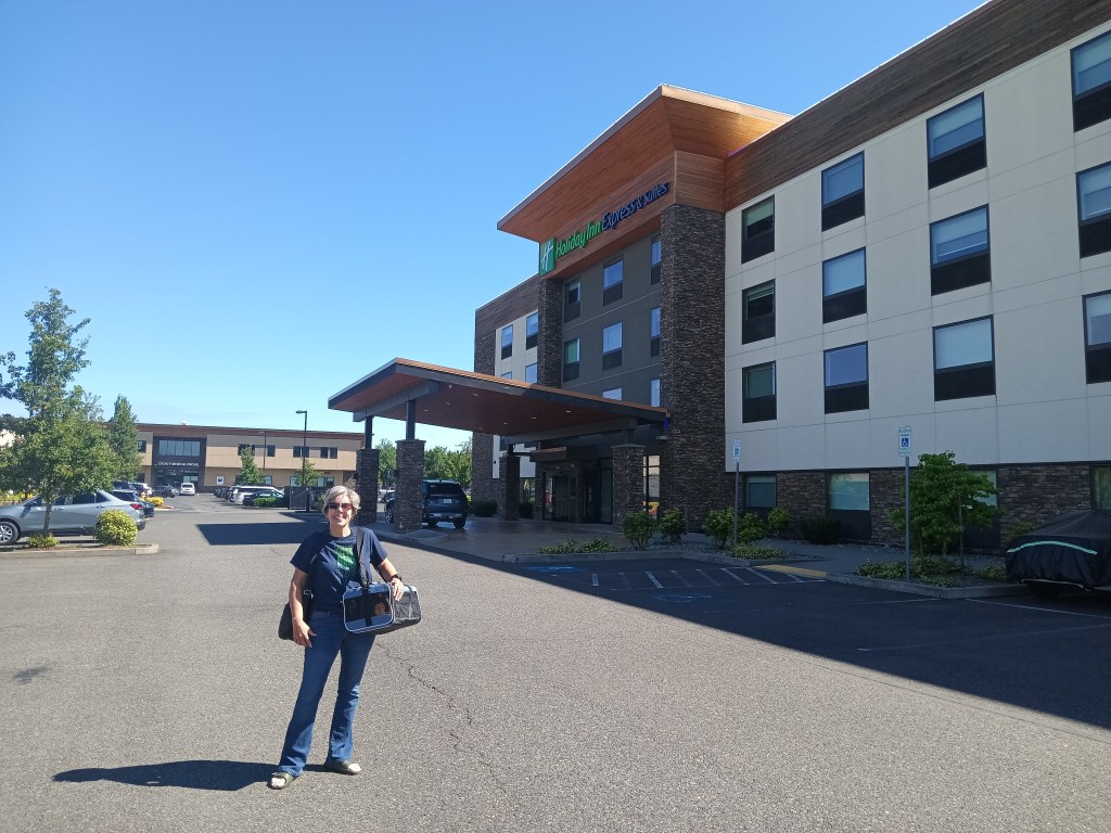 Fortunately, Mama C found the Holiday Inn Express in Camas, the town just east of us, to be very accommodating to feline travelers. So off in the car we went again, me in my carrier on Mama C’s lap. Lately when we travel she’s been letting me come out a little bit, which I enjoy. I like to make sure Mama G is coming to a full stop at the stop signs!