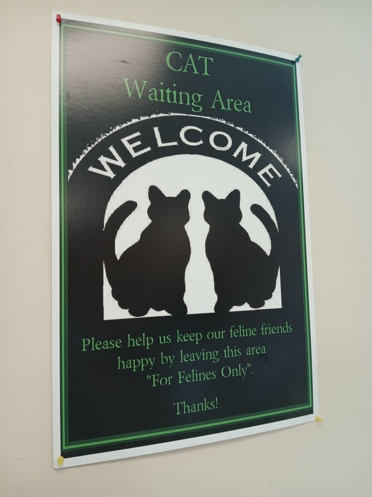 I wasn’t especially happy to be back in my carrier, the one in which I spent 11 hours traveling out here not so long ago, but this trip lasted only three minutes by car, and then we pulled up in front of the Cascade Park Animal Hospital. I had some trepidation, of course, because I never have a clue as to what’s about to happen to me when I go to such places. But we received a pleasant greeting upon entering, and sat ourselves underneath this sign: