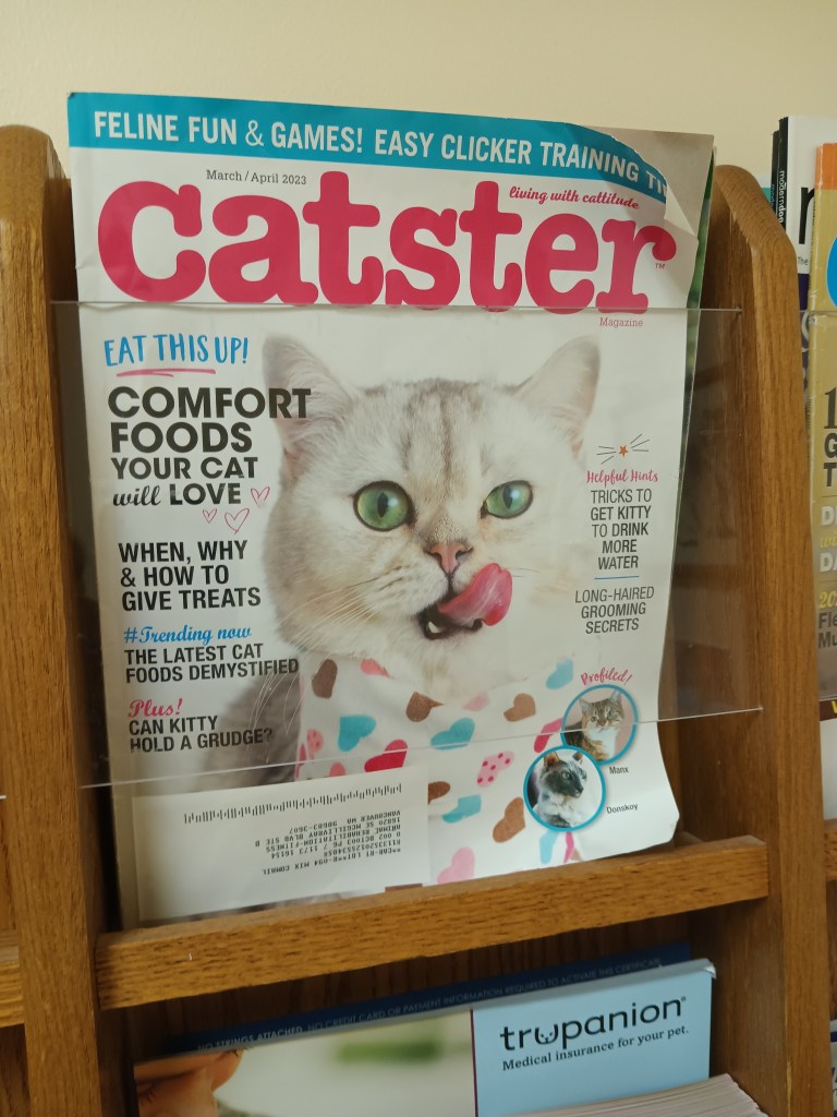Now I’ve never heard of Catster before, but I’ll take this opportunity to answer a few of the teaser headlines on the cover in order to spare you the subscription cost, if you were so inclined. Comfort Foods? Tuna, tuna, tuna! When, Why and How to Give Treats? At least every hour, and whenever I cry for more. Can Kitty Hold a Grudge? You betcha!!! Tricks to Get Kitty to Drink More Water? Well I’ve already posted frequently about that topic: Just leave your water glass sitting out and I will hydrate like never before!
