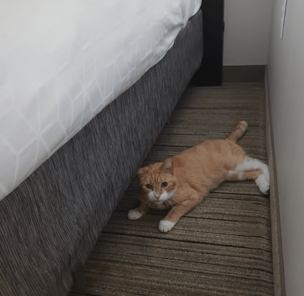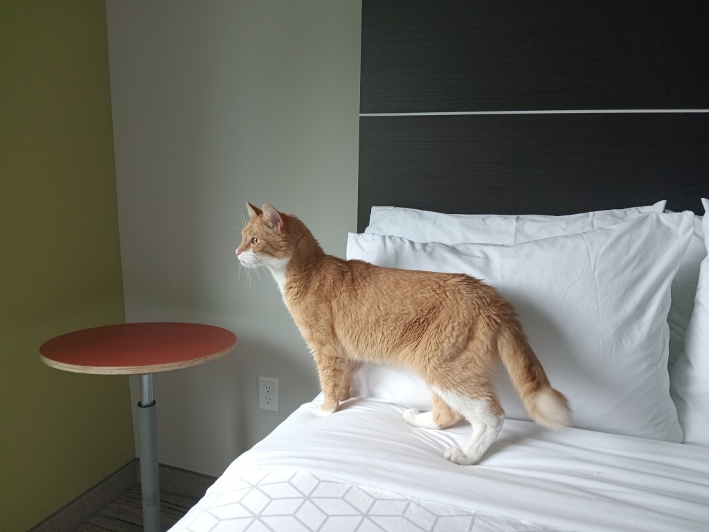 I watched TV on bed with Those Two for a while, then slept pretty soundly. The next morning, as we prepared to check out, I felt almost a little sad. Although we cats generally love the familiar and routine, there’s something to be said for leaving your comfort zone and trying new things.