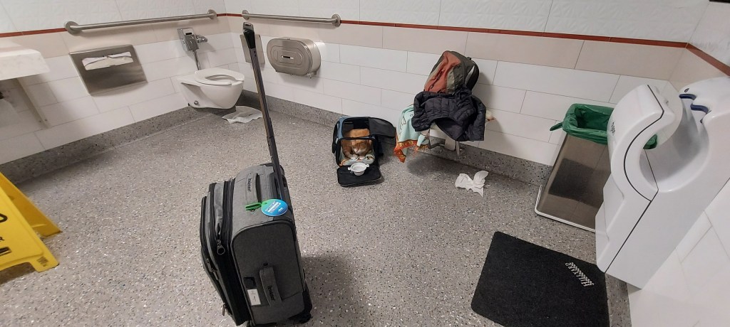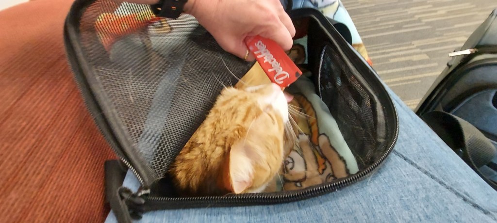 I forgot to mention one key event in yesterday’s installment. Both Mama C and I had to go through some sort of screening before we could advance! I was taken out of my carrier and held in place on a table by a nice lady in a uniform. She was carrying on about how handsome I was. I tend to have that effect on the ladies. Anyway, my carrier went through some sort of machine, and Mama C went through another. We were reunited shortly afterward and back in the carrier I went.