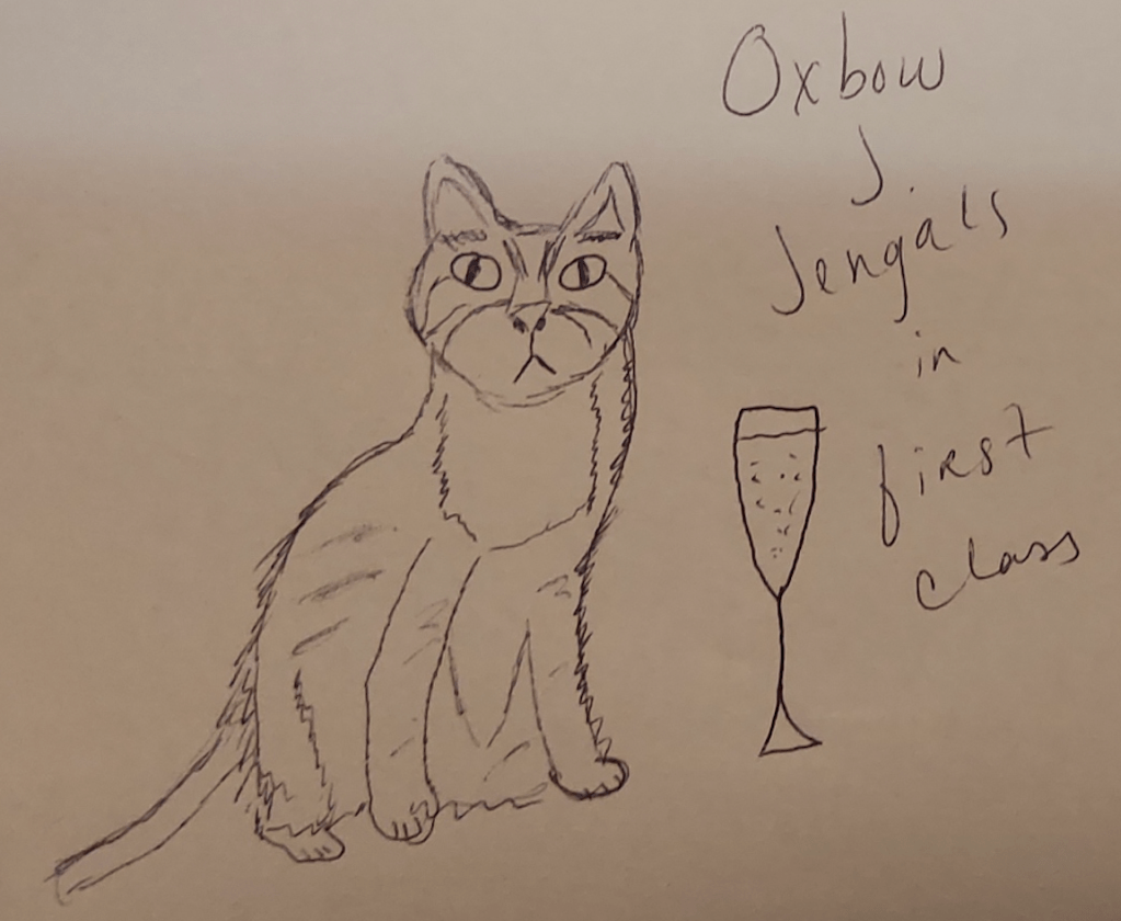 After our bathroom stops and a brief snack break, in which Mama C opened my carrier slightly and fed me a lickable treat out of a pouch like a baby, we were on our way to the gate. Soon we were lining up to board the airplane. We were among the first to board, because Mama G had sprung for a ticket in first class for us, figuring we’d both be more comfortable. One of Mama C’s former coworkers thought it was funny that I’d be at the front end of the plane and drew a picture of what it might be like: