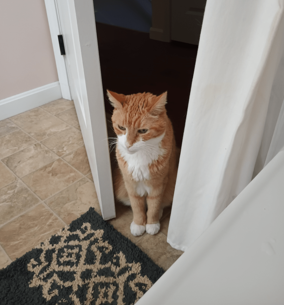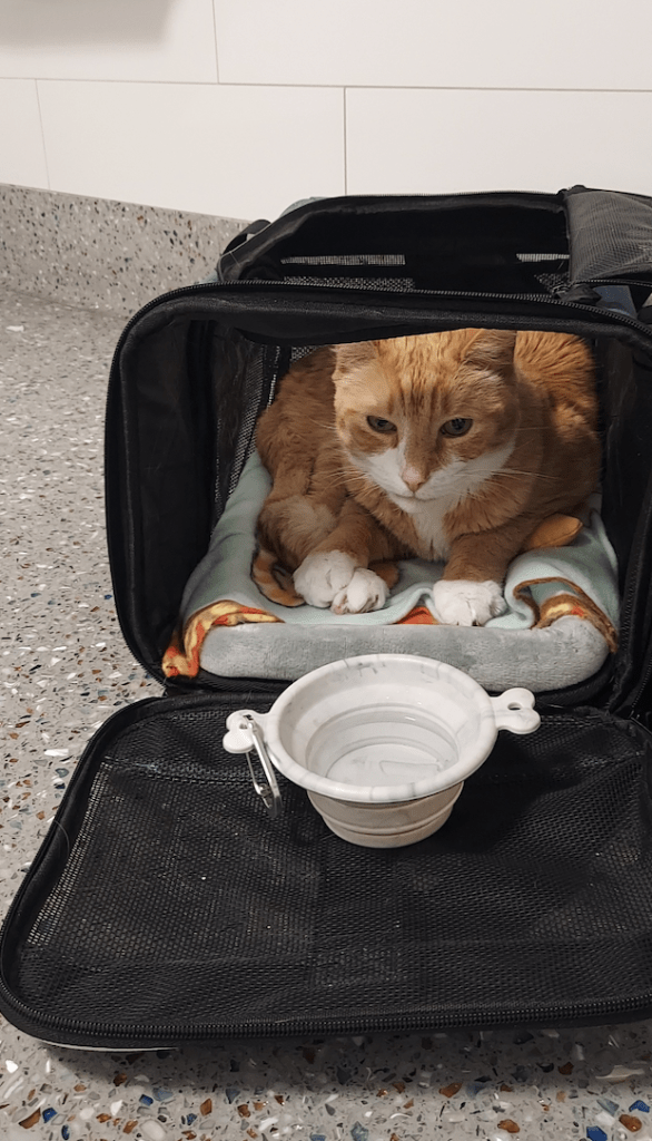 About midway through the flight, which lasted six hours, I was longing for that family bathroom again. I really had to go and was squirming around something fierce, to hear Mama C tell it. Well, when a guy’s gotta go, he’s gotta go. Fortunately Mama C had put a pee pad in my carrier, so no one was the wiser until she went to clean it out several days later.